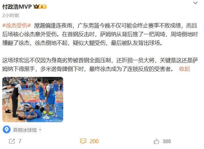 確實,盡管今晚的比賽薩姆納轟下35分是撐起廣東隊前三節主要得分的功臣,場上表現確實無可爭議,攻防兩端也確實足夠拚,他也在第四節拚到了受傷下場,態度上沒的說,但有一說一,徐傑的受傷確實和他分不開關係,這個鍋隻能由薩姆納來背。