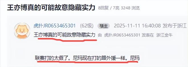 對於王奕博,浙江球迷又愛雙恨,愛的是他為浙江全運隊做出積極貢獻,恨的是他已離開浙江隊來到山東青島,已不再是浙江隊的隊員了。浙江球迷對於王奕博的爆發感到十分意外,也感到非常後悔,他們不知王奕博如今為何能爆發,之前完全不是這個狀態啊。為此浙江球迷浮想聯翩。他們認為王亦博上賽季可能故意隱藏實力,故意擺爛鬧離隊的,目的就是為了到青島隊為恩師劉維偉打球。更有球迷懷疑王奕博和劉維偉商量好了搞方俊?