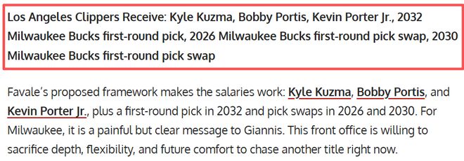 通過這筆交易,快船不僅能得到庫茲馬、波蒂斯、波特三位即戰力球員,更能獲得寶貴的未來選秀資產。庫茲馬具備較強的攻框和空切能力,轉換進攻效率不俗;波蒂斯則是優質的第六人得分手,銜接段能扛球權,且具備不錯的三分投射能力和籃板保護能力,兩人都能為快船提供可用的輪換火力,小波特與哈登搭檔後場,快船的陣容年輕化,雖然不具備爭冠實力,但保證票房和保證季後賽問題不大。而得到的雄鹿未來選秀權和選秀權交換權,更是讓快船掌握了重建的關鍵籌碼——如果未來字母哥狀態波動或尋求離隊,這些與雄鹿戰績掛鉤的選秀權將極具價值,有望幫助快船積累重建所需的年輕人才。