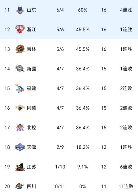 前十一輪過後,廣廈隊、上海隊、北京隊、廣東隊分列積分榜前四名,巧合的是,以上四隊的戰績都是9勝2負。