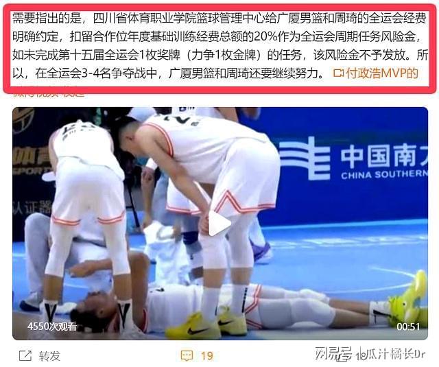 賽後更猛的瓜來了。CBA權威媒體人付政浩曝料,四川省體育職業學院籃管中心在給廣廈、給周琦製定全運會經費時,帶了一條“任務風險金”的條款:基礎訓練經費裏先扣20%當風險金,拿不到獎牌,再扣20%。這條款一出,外界立刻把焦點對準了周琦的那筆600萬。按曝料的說法推一下賬:要是四川無緣獎牌,周琦這600萬很可能被扣掉一部分,保不齊還要少120萬,隻到手480萬。這筆錢可不是小數目,輿論馬上炸鍋。