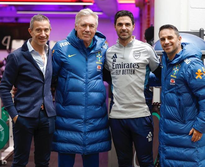 巴西隊在阿森納基地訓練,安切洛蒂與阿爾特塔會麵並合影