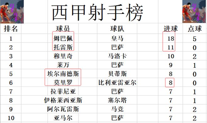 射手榜方麵,姆巴佩18球繼續領跑,托雷斯11球位列第2,穆裏奇10球排在第3,萊萬9球位列第4。莫裏羅今天傳射建功,追上埃爾南德斯,兩人8球並列第5。拉菲尼亞,亞馬爾和阿爾瓦雷斯等人7球剛好擠入前十。