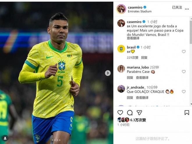 卡塞米羅社媒曬出比賽照片,寫道:“全隊都表現出色,向世界杯又邁進一步!加油巴西!”