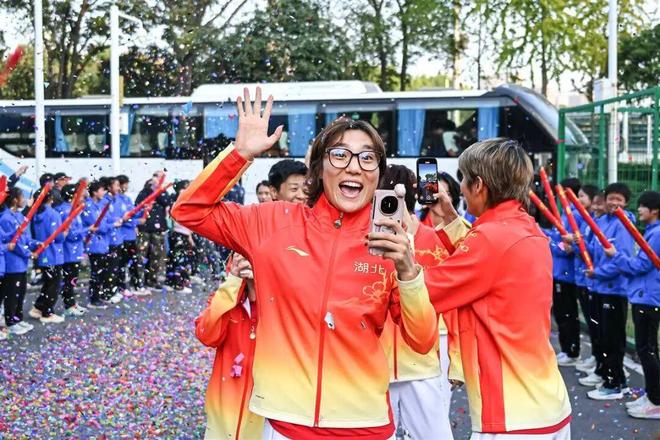 禮花噴薄而出,掌聲如雷響起。當姚偉、吳海燕、陳晨等球員走下大巴時,瞬間被小球迷們團團圍住。簽名、合影,姑娘們耐心地滿足著每一個要求。吳海燕在合影間隙,摸了摸小球員的頭,滿是期許地說道:“未來就靠你們啦!”