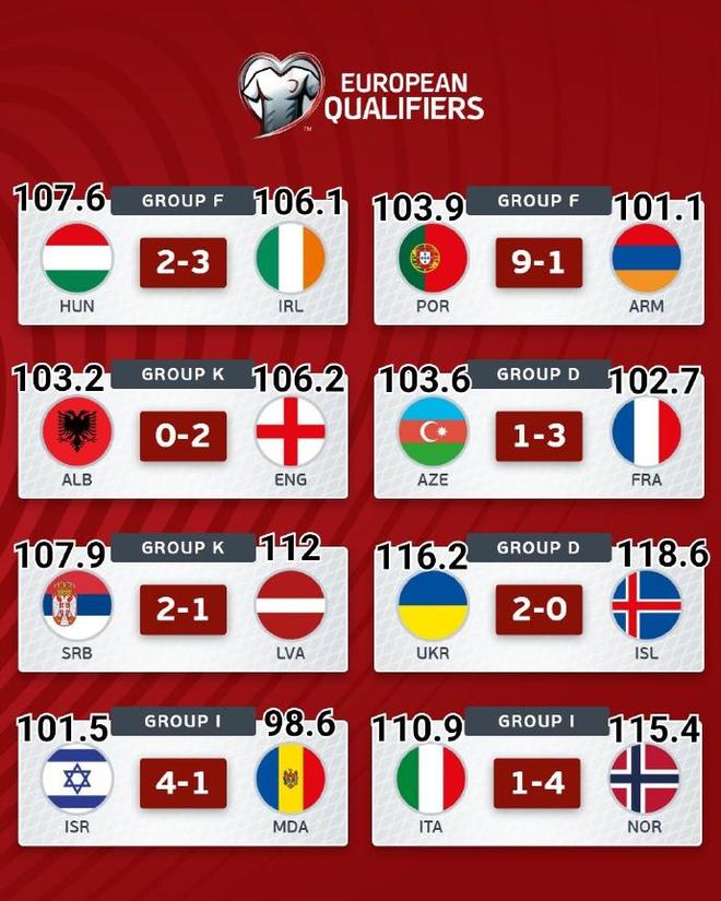 從世預賽統計數據可以看到,除了烏克蘭隊2比0擊敗冰島隊,以及意大利與挪威隊的比賽,4支球隊完成了讓人吃驚的跑動量,其他比賽的平均跑動量甚至低於105公裏。