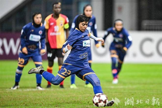 11月17日下午,巴姆卡通女足(伊朗)隊員哈穆迪在比賽中罰射點球。(湖北日報全媒記者任勇攝)