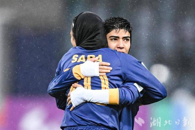 11月17日下午,巴姆卡通女足(伊朗)隊員哈穆迪罰進點球後與隊友擁抱慶祝。(湖北日報全媒記者任勇攝)