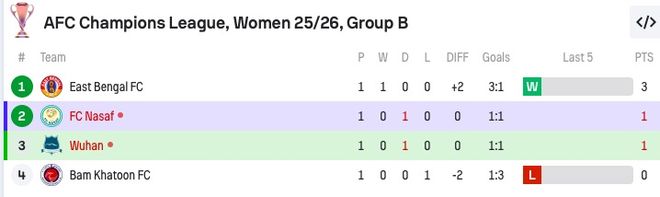 本輪過後,東孟加拉1勝積3分暫列榜首,武漢女足和納薩夫都是1平積1分,巴姆卡通積0分墊底。