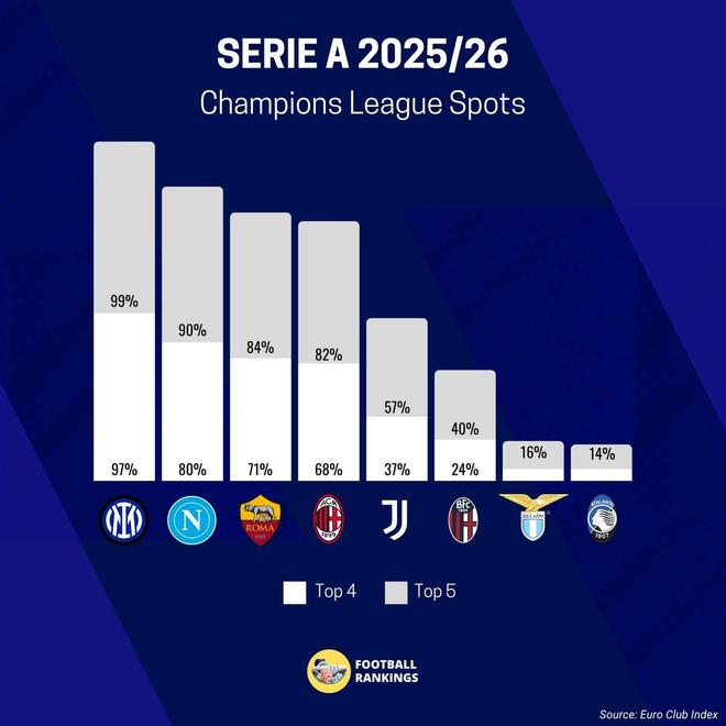 北京時間11月11日,Football Rankings預測了本賽季意甲強隊最終進入聯賽前四名並獲得歐冠資格的概率,其中國際米蘭以97%高居第一,AC米蘭68%,尤文圖斯僅37%。