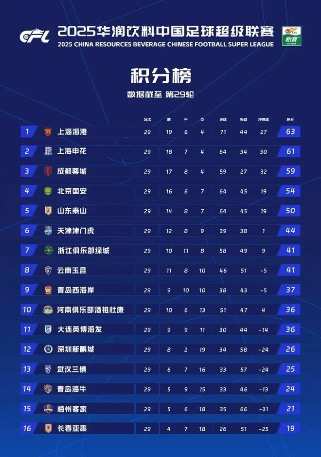 爭冠賽道上,上海海港與上海申花的“同城德比”延伸至賽季終章。積分榜上,海港以63分領跑,申花61分緊隨其後,兩隊本賽季交鋒海港1勝1平占據優勢,這讓海港手握“打平即奪冠”的主動權。末輪海港客場挑戰已保級的大連英博,隻需守住不敗就能實現三連冠偉業;而申花必須在客場擊敗天津津門虎,同時寄望大連英博在主場阻擊海港,才能完成逆風翻盤。